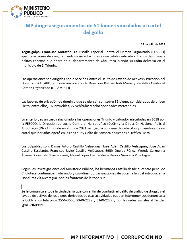 Lo anterior, es un caso relacionado a las operaciones Triunfo y Labrador ejecutadas en 2018 por la FESCCO, la Dirección de Lucha Contra el Narcotráfico (DLCN) y la Dirección Nacional Policial Antidrogas (DNPA), donde en abril de 2021 se logró la condena de cabecillas y miembros de un cartel que por años operó en la zona sur y Golfo de Fonseca dedicados al tráfico ilícito.