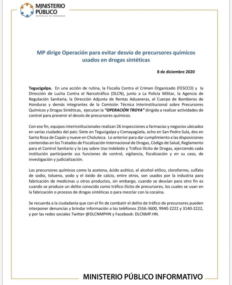 Tegucigalpa. En una acción de rutina, la Fiscalía Contra el Crimen Organizado (FESCCO) y la Dirección de Lucha Contra el Narcotráfico (DLCN), junto a La Policía Militar, la Agencia de Regulación Sanitaria, la Dirección Adjunta de Rentas Aduaneras, el Cuerpo de Bomberos de Honduras y demás integrantes de la Comisión Técnica Interinstitucional sobre Precursores Químicos y Drogas Sintéticas, ejecutan la “OPERACIÓN TROYA” dirigida a realizar actividades de control para prevenir el desvío de precursores químicos.