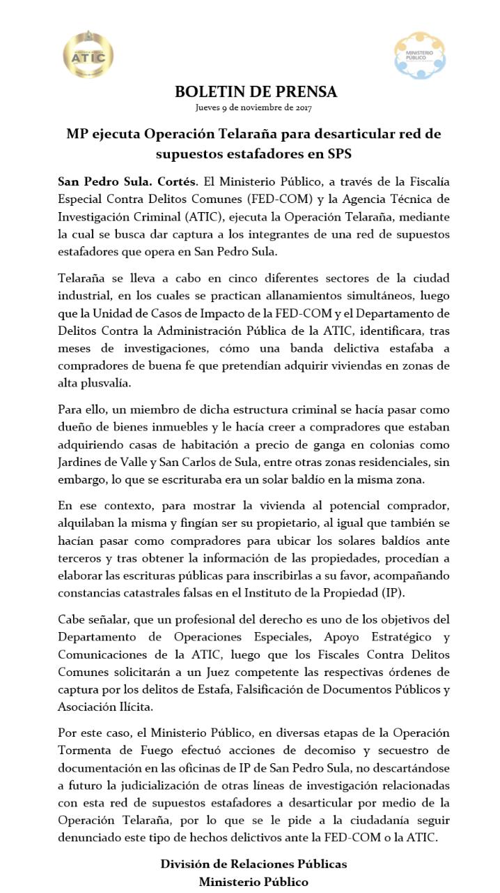 Por este caso, el Ministerio Público, en diversas etapas de la Operación Tormenta de Fuego efectuó acciones de decomiso y secuestro de documentación en las oficinas de IP de San Pedro Sula, no descartándose a futuro la judicialización de otras líneas de investigación relacionadas con esta red de supuestos estafadores a desarticular por medio de la Operación Telaraña, por lo que se le pide a la ciudadanía seguir denunciado este tipo de hechos delictivos ante la FED-COM o la ATIC.