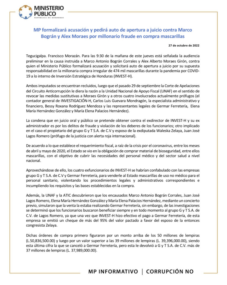 Tegucigalpa. Francisco Morazán. Para las 9:30 de la mañana de este jueves está señalada la audiencia preliminar en la causa instruida a Marco Antonio Bográn Corrales y Alex Alberto Moraes Girón, contra quien el Ministerio Público formalizará acusación y solicitará auto de apertura a juicio por su supuesta responsabilidad en la millonaria compra irregular de 474 mil mascarillas durante la pandemia por COVID-19 a lo interno de Inversión Estratégica de Honduras (INVEST-H).