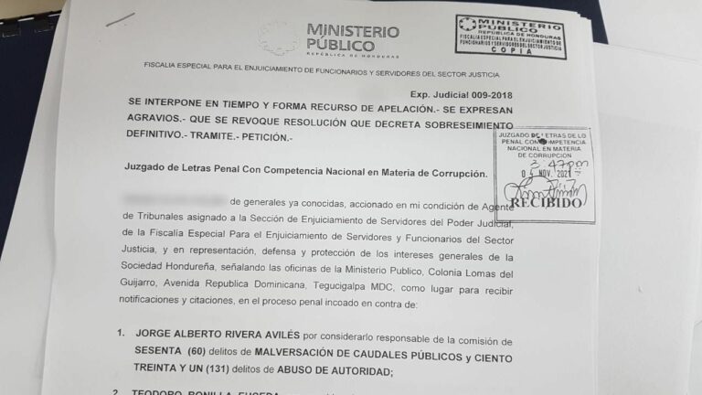 Tegucigalpa. Francisco Morazán. La Fiscalía Especial para el Enjuiciamiento de Funcionarios y Servidores del Sector Justicia (FEEFS-SJ) interpuso en las últimas horas un recurso de apelación luego de la resolución judicial dictada el pasado 1 de noviembre y que favorece al pleno del extinto Consejo de la Judicatura y Carrera Judicial, entre ellos su presidente Jorge Rivera Avilés, con un sobreseimiento definitivo por varios delitos.