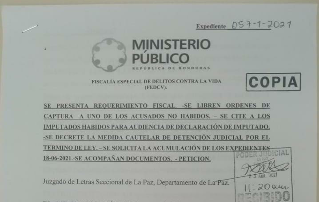 Tegucigalpa. Francisco Morazán. Después de desarrollarse la audiencia inicial en contra de cuatro involucrados de la muerte al líder indígena Félix Vásquez López, la Fiscalía Especial de Delitos Contra la Vida (FEDCV) obtuvo un auto de formal procesamiento con la medida de prisión preventiva.