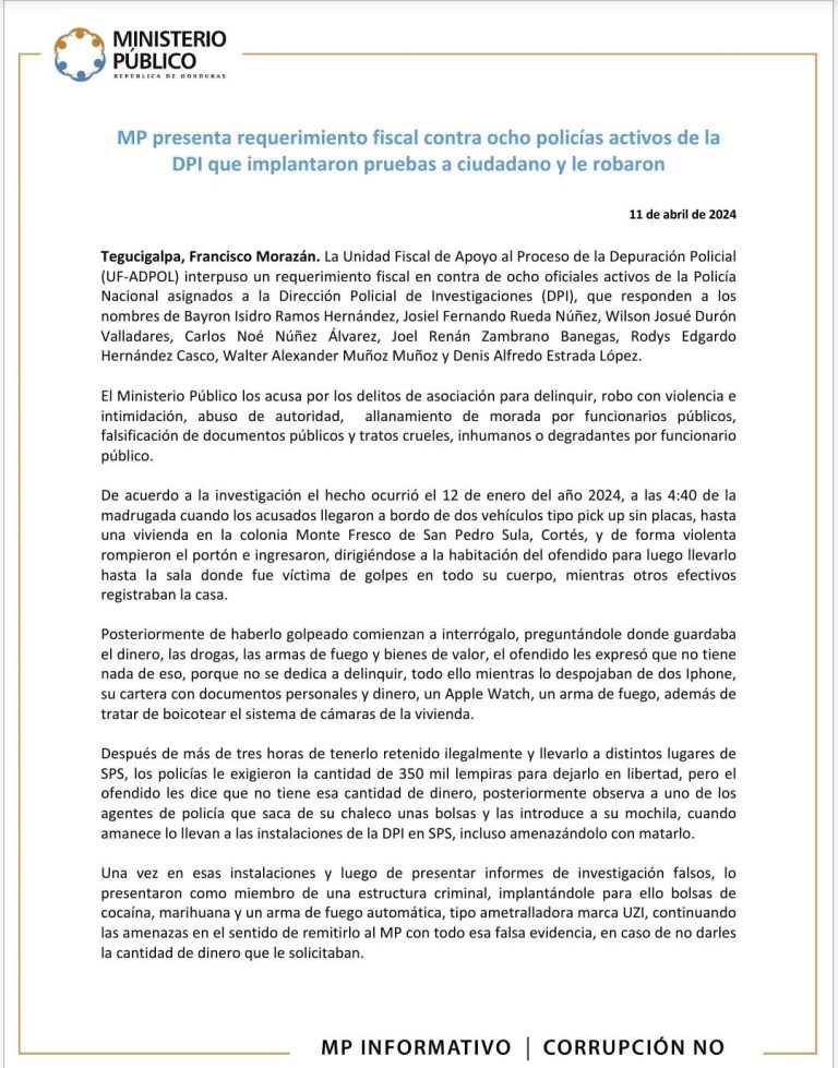 Tegucigalpa, Francisco Morazán. La Unidad Fiscal de Apoyo al Proceso de la Depuración Policial (UF-ADPOL) interpuso un requerimiento fiscal en contra de ocho oficiales activos de la Policía Nacional asignados a la Dirección Policial de Investigaciones (DPI), que responden a los nombres de Bayron Isidro Ramos Hernández, Josiel Fernando Rueda Núñez, Wilson Josué Durón Valladares, Carlos Noé Núñez Álvarez, Joel Renán Zambrano Banegas, Rodys Edgardo Hernández Casco, Walter Alexander Muñoz Muñoz y Denis Alfredo Estrada López.