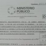 El requerimiento fiscal se ha presentado ante el juzgado de letras seccional de La Paz y cabe señalar que tres de los imputados ya guardan prisión por otra causa criminal, siendo no habido únicamente uno de los involucrados.