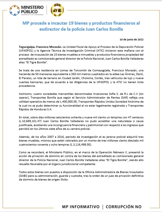 Como se recordará, el Ministerio Público, en el marco de la Operación Némesis V, presentó la acción de privación de dominio en contra de los bienes del extraditado ex comisionado general director de la Policía Nacional, Juan Carlos Bonilla Valladares alias “El Tigre Bonilla”, siendo ello resuelto favorable por el órgano jurisdiccional competente.