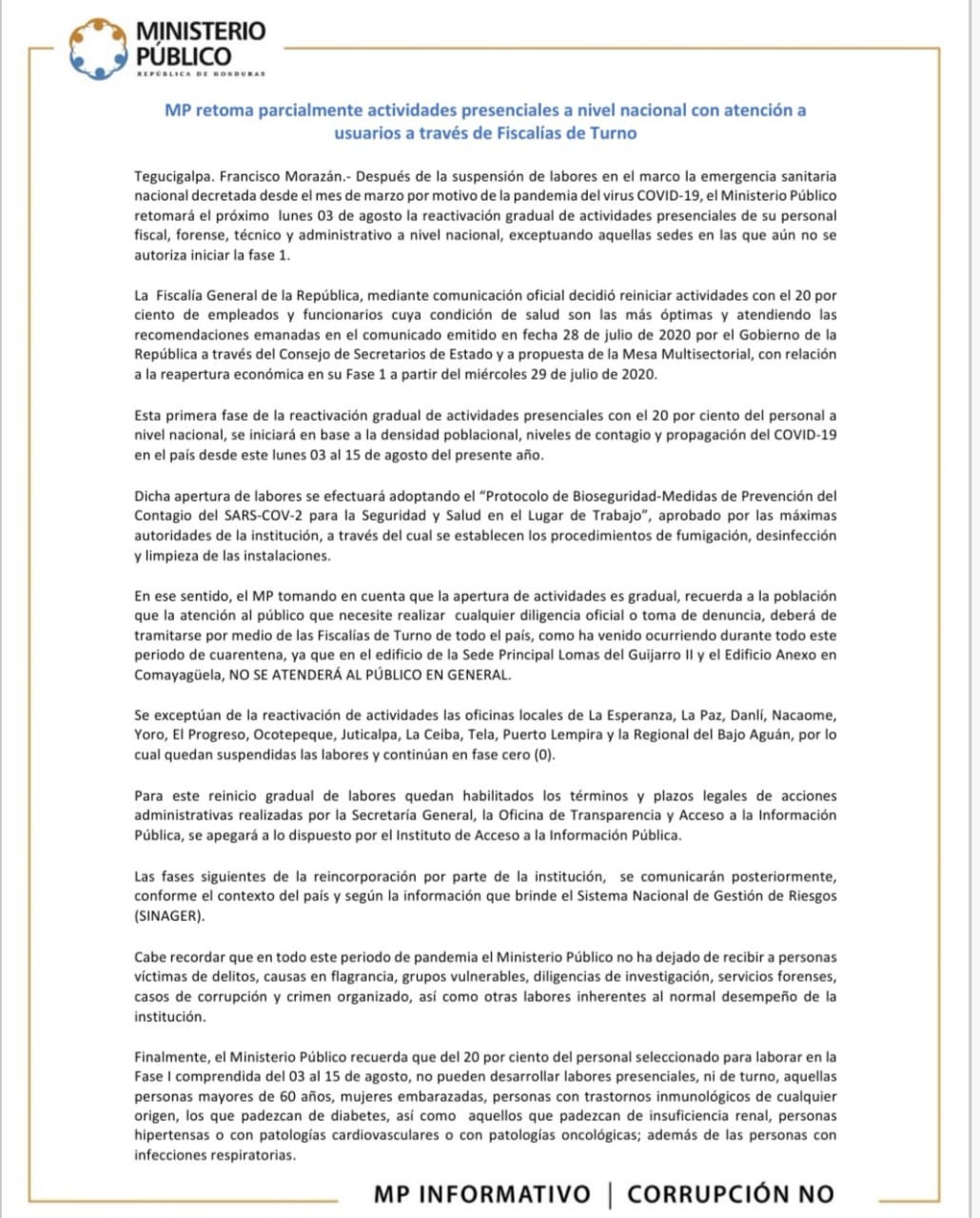 Tegucigalpa. Francisco Morazán.- Después de la suspensión de labores en el marco la emergencia sanitaria nacional decretada desde el mes de marzo por motivo de la pandemia del virus COVID-19, el Ministerio Público retomará el próximo lunes 03 de agosto la reactivación gradual de actividades presenciales de su personal fiscal, forense, técnico y administrativo a nivel nacional, exceptuando aquellas sedes en las que aún no se autoriza iniciar la Fase 1.
