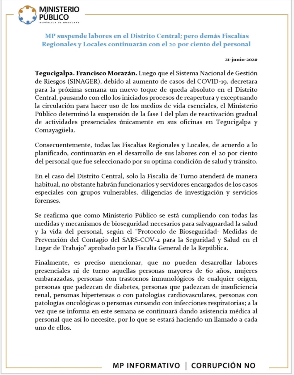 Tegucigalpa. Francisco Morazán. Luego que el Sistema Nacional de Gestión de Riesgos (SINAGER), debido al aumento de casos del COVID-19, decretara para la próxima semana un nuevo toque de queda absoluto en el Distrito Central, pausando con ello los iniciados procesos de reapertura y exceptuando la circulación para hacer uso de los medios de vida esenciales, el Ministerio Público determinó la suspensión de la fase I del plan de reactivación gradual de actividades presenciales únicamente en sus oficinas en Tegucigalpa y Comayagüela.
