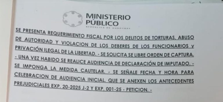 En ese sentido, se presentó requerimiento fiscal contra los policías Kevin Justiniano Oseguera Centeno, Lesli Yasmin Varela Canales, Carlos Orlando Mejía Pineda, Fredis Anael Reyes López, Wilson David Girón Girón, Olkin Otilio Gutiérrez Bonilla, Christian Ricardo Gutiérrez Portillo, Delmer Samir Flores Nieto, Edys Antonio Gonzales Ordoñez, Dani Francisco Rodríguez Turcios y Yuri Finlander Galiano Rodas, a quienes se les supone responsables de los delitos de torturas, abuso de autoridad, violación de los deberes de los funcionarios y privación ilegal de la libertad en perjuicio de cuatro personas.