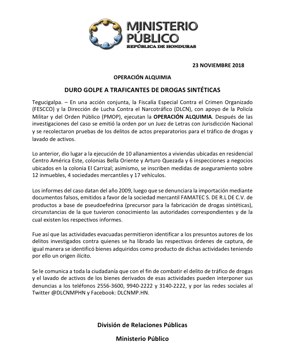 Tegucigalpa. – En una acción conjunta, la Fiscalía Especial Contra el Crimen Organizado (FESCCO) y la Dirección de Lucha Contra el Narcotráfico (DLCN), con apoyo de la Policía Militar y del Orden Público (PMOP), ejecutan la OPERACIÓN ALQUIMIA. Después de las investigaciones del caso se emitió la orden por un Juez de Letras con Jurisdicción Nacional y se recolectaron pruebas de los delitos de actos preparatorios para el tráfico de drogas y lavado de activos.