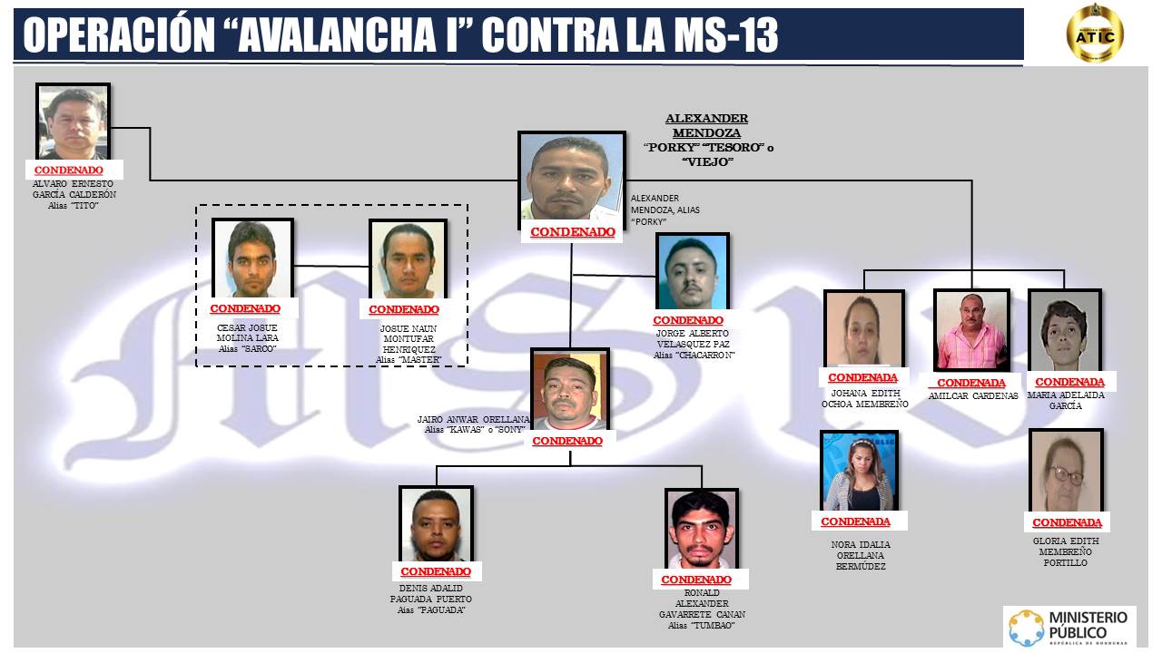 Además, con la Operación Avalancha I se judicializaron las muertes violentas cometidas por los líderes y miembros de la estructura criminal de la MS-13 a las víctimas Germán Omar García Maradiaga, José Yovanny Cruz Fonseca, Jonathan Cruz Osorto, Patrick Xavier Cruz Rivera, Franklin Isacc Ordóñez Bautista, Juan Francisco Castro, Nelson Adalid Hernández Ponce, José Javier Ramos Rodríguez y José Durán Avilez Alvarado.