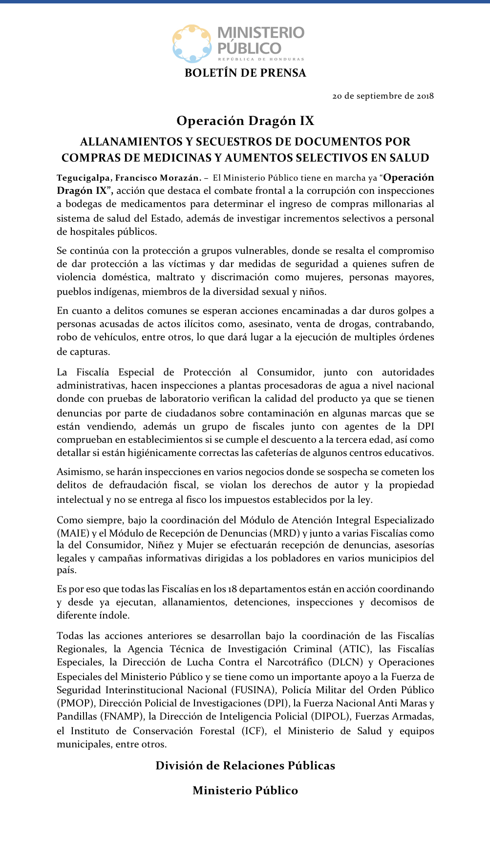 COMUNICADO INICIAL DTegucigalpa, Francisco Morazán. – El Ministerio Público tiene en marcha ya “Operación Dragón IX”, acción que destaca el combate frontal a la corrupción con inspecciones a bodegas de medicamentos para determinar el ingreso de compras millonarias al sistema de salud del Estado, además de investigar incrementos selectivos a personal de hospitales públicos.
