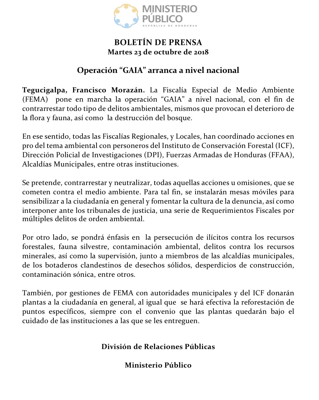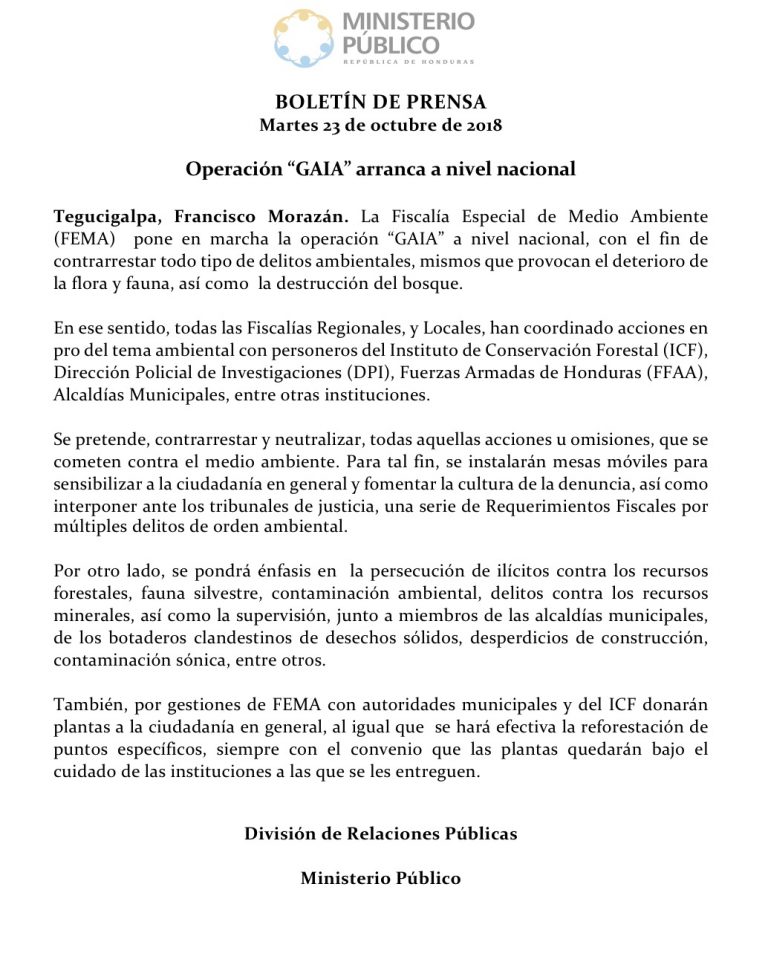 Tegucigalpa, Francisco Morazán. La Fiscalía Especial de Medio Ambiente (FEMA) pone en marcha la operación “GAIA” a nivel nacional, con el fin de contrarrestar todo tipo de delitos ambientales, mismos que provocan el deterioro de la flora y fauna, así como la destrucción del bosque.
