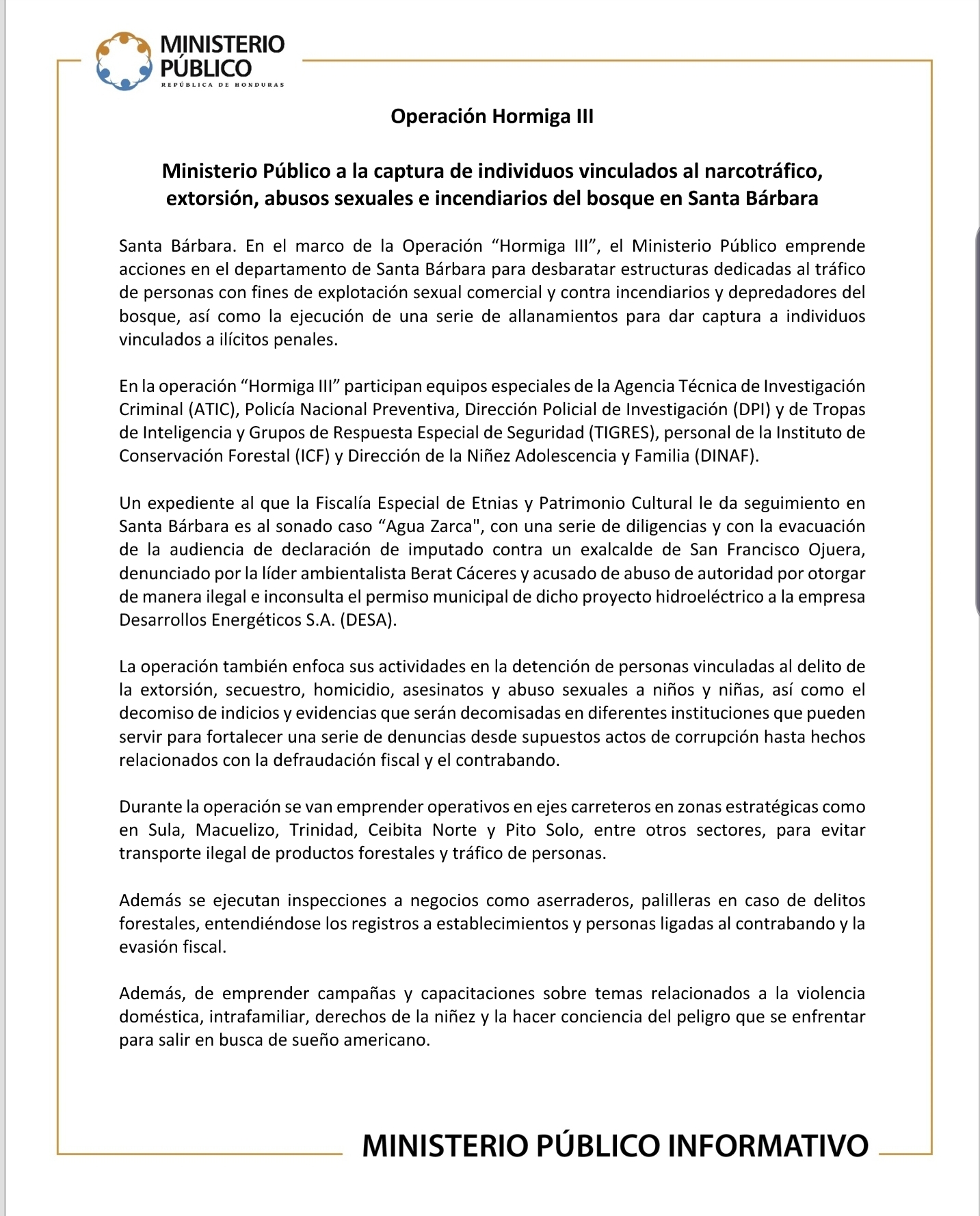 Santa Bárbara. En el marco de la Operación “Hormiga III”, el Ministerio Público emprende acciones en el departamento de Santa Bárbara para desbaratar estructuras dedicadas al tráfico de personas con fines de explotación sexual comercial y contra incendiarios y depredadores del bosque, así como la ejecución de una serie de allanamientos para dar captura a individuos vinculados a ilícitos penales.