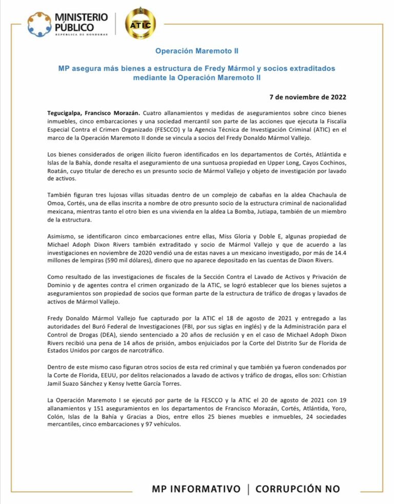 Tegucigalpa, Francisco Morazán. Cuatro allanamientos y medidas de aseguramientos sobre cinco bienes inmuebles, cinco embarcaciones y una sociedad mercantil son parte de las acciones que ejecuta la Fiscalía Especial Contra el Crimen Organizado (FESCCO) y la Agencia Técnica de Investigación Criminal (ATIC) en el marco de la Operación Maremoto II donde se vincula a socios del Fredy Donaldo Mármol Vallejo.