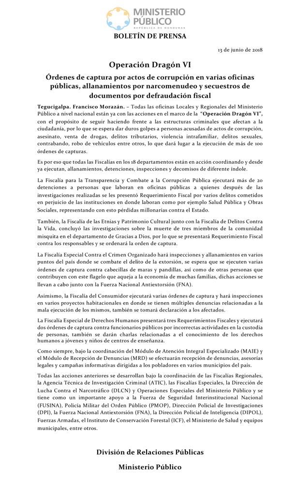 Tegucigalpa. Francisco Morazán. – Todas las oficinas Locales y Regionales del Ministerio Público a nivel nacional están ya con las acciones en el marco de la “Operación Dragón VI”, con el propósito de seguir haciendo frente a las estructuras criminales que afectan a la ciudadanía, por lo que se espera dar duros golpes a personas acusadas de actos de corrupción, asesinato, venta de drogas, delitos tributarios, violencia intrafamiliar, delitos sexuales, contrabando, robo de vehículos entre otros, lo que dará lugar a la ejecución de más de 100 órdenes de capturas.