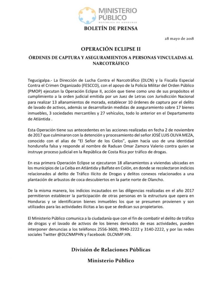 Tegucigalpa.- La Dirección de Lucha Contra el Narcotráfico (DLCN) y la Fiscalía Especial Contra el Crimen Organizado (FESCCO), con el apoyo de la Policía Militar del Orden Público (PMOP) ejecutan la Operación Eclipse II, acción que tiene como uno de sus propósitos el cumplimiento a la orden judicial emitida por un Juez de Letras con Jurisdicción Nacional para realizar 13 allanamientos de morada, establecer 10 órdenes de captura por el delito de lavado de activos, además se desarrollarán medidas de aseguramiento sobre 17 bienes inmuebles, 3 sociedades mercantiles y 27 vehículos, todo lo anterior en el Departamento de Atlántida .