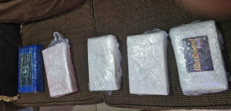 Detectives de la DLCN fijaron los cinco kilos de supuesta cocaína, de los cuales tres de ellos solo estaban forrados con polipel transparente, uno con un diseño de aparentes letras y números, además de un quinto con la leyenda “Que chimba, parce”.