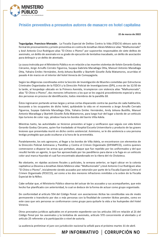 La causa instruida por el Ministerio Público es en relación a las muertes violentas de Kelvin Gerardo Godoy Cárcamo, Jorge Arnulfo Cerrato Figueroa, Suyapa Gabriela Maradiaga Otta, Manuel Antonio Maradiaga Otta, Yahaira Emilec Hernández, Arely Johana Bustillo y Skarteth Gisselle Ávila Matamoros, ocurridas el pasado 4 de marzo en el interior del hotel Venecia de Comayagüela.