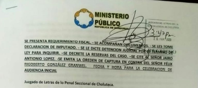 Tegucigalpa, Francisco Morazán.- El Ministerio Público, a través de la Unidad Fiscal de Operaciones Especiales (OPE), presentó hoy en la ciudad de Choluteca un Requerimiento Fiscal contra el ciudadano Jairo Antonio López por los delitos de Tenencia de Explosivos Comerciales, Tenencia de Artefactos de Construcción Casera, Tenencia ilegal de Sustancias Controladas (Pólvora con Clorato) y además Atentado en perjuicio de la Seguridad Interior del estado, a este ciudadano se le supone responsable también del delito de Tenencia de Equipo Policial.