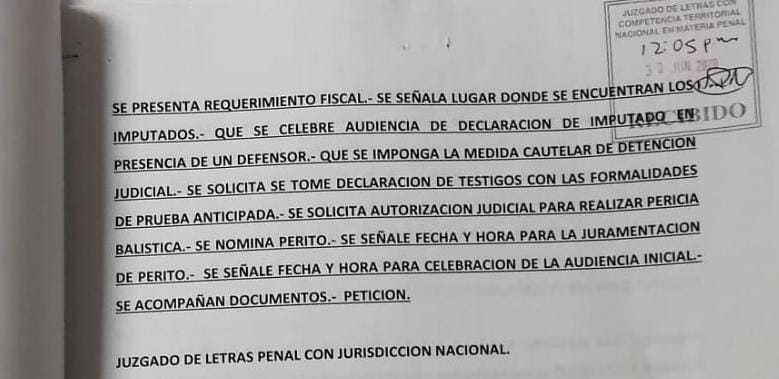 El caso se interpuso ante el Juzgado Penal con Jurisdicción Nacional por parte de la Fiscales de la Sección de Investigación de Estructuras Criminales Organizadas, quienes piden se señale lugar donde se encuentran los privados de libertad acusados, se celebre la audiencia de declaración de imputado de rigor y se imponga medida cautelar de Detención Judicial.