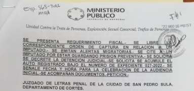 San Pedro Sula, Cortés. – Un requerimiento fiscal contra una persona del sexo femenino, considerada cabecilla de una estructura vinculada al delito de trata de personas agravada, se presentó ante los tribunales sampedrano solicitando alerta roja internacional, en el marco de la Operación Amanecer III.