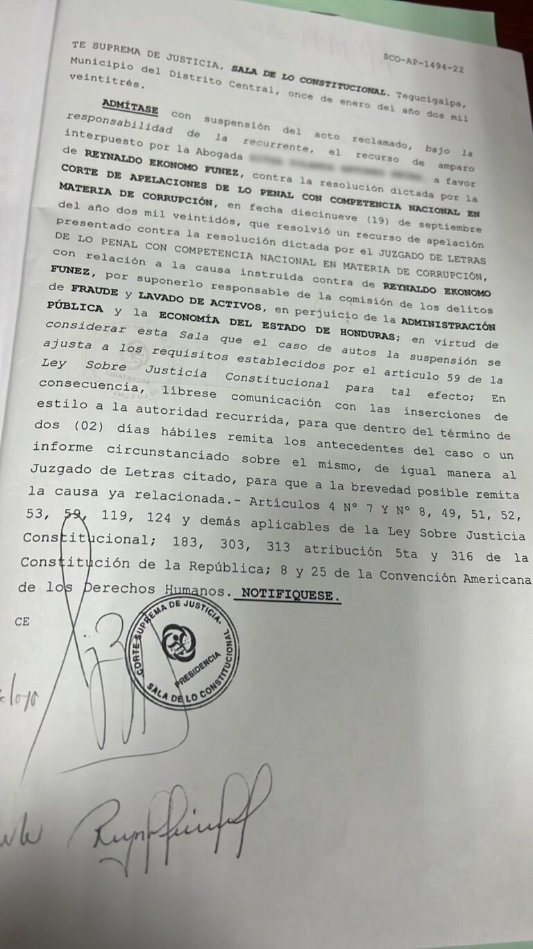 Tegucigalpa. Francisco Morazán. Al admitirse con suspensión del acto reclamado un recurso de amparo presentado por la defensa privada del exdiputado Reynaldo Geovanny Ekonomo ante la Sala Constitucional de la Corte Suprema de Justicia (CSJ), se cancela la audiencia preliminar señalada para este lunes 23 de enero.