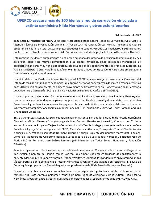 Tegucigalpa, Francisco Morazán. La Unidad Fiscal Especializada Contra Redes de Corrupción (UFERCO) y la Agencia Técnica de Investigación Criminal (ATIC) ejecutan la Operación Las Moiras, mediante la cual se aseguran e incautan un total de 103 bienes, sociedades mercantiles y productos financieros a exfuncionarios públicos, entre ellos, la extinta exministra de Comunicaciones y Estrategia, Hilda Rosario Hernández Alvarado.