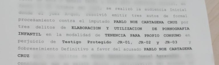 Tegucigalpa, Francisco Morazán. – La Unidad Contra la Trata, Explotación Sexual Comercial y Tráfico de Personas (UTESCTP), obtuvo auto de formal procesamiento contra Pablo Noé Cartagena Cruz, a quien se le supone responsable de tres delitos posesión de pornografía infantil, un delito de exhibicionismo agravado, en perjuicio de tres víctimas identificadas como testigos protegidos.